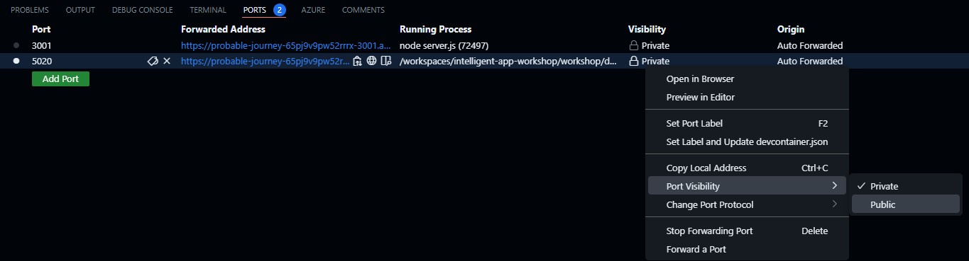 API_URLwill be different if using Github Codespace, e.g.https://awesome-journey-65pj9v9pw52rrrx-5020.app.github.dev/chat):- From